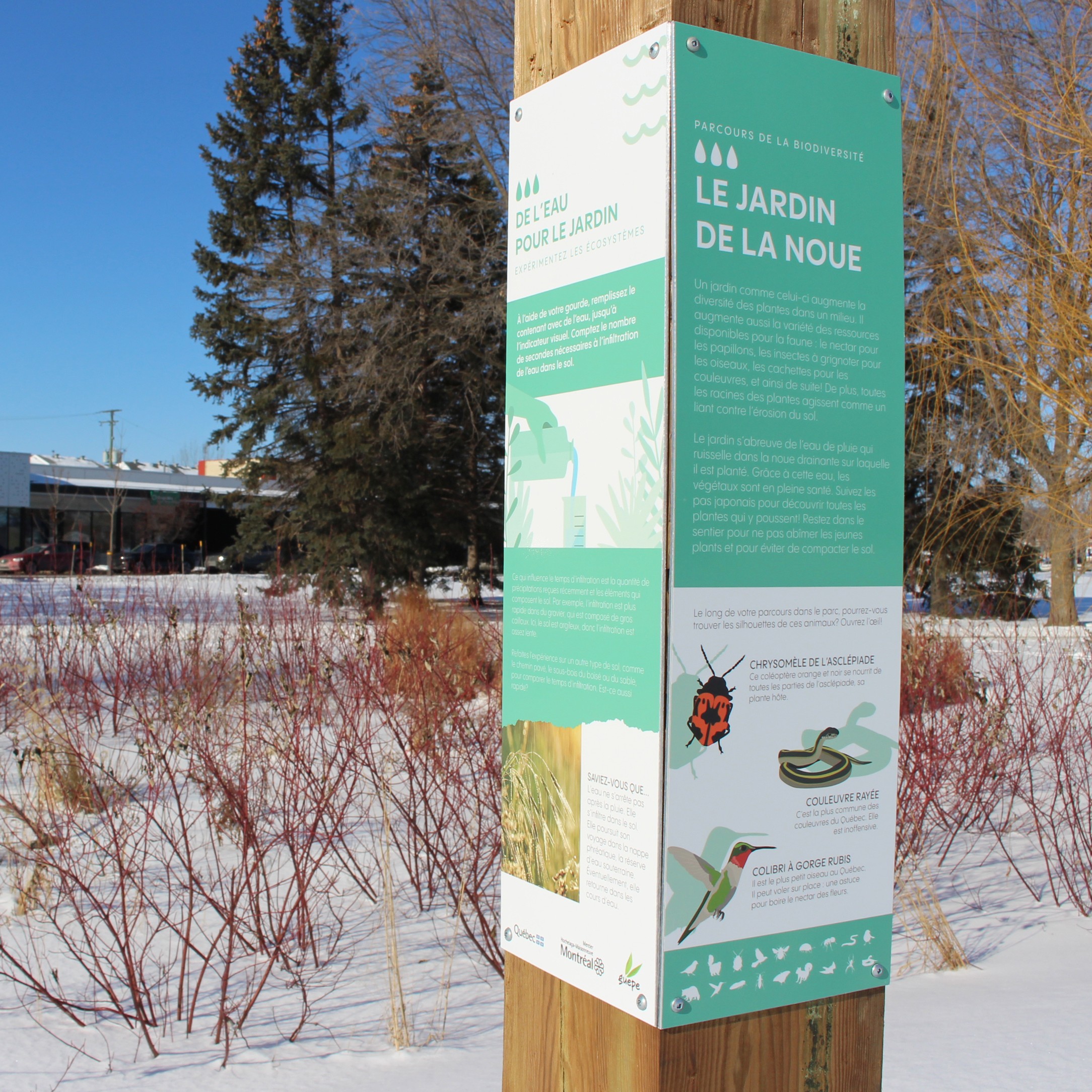 Un parcours éducatif et interactif a été créé au cœur du parc urbain Honoré-Mercier pour faire découvrir la richesse des écosystèmes en ville. Il comprend six stations thématiques dotées de panneaux informatifs et d’activités adaptées à tous les âges, permettant aux participant·e·s d’explorer et de comprendre la biodiversité locale. Un jeu global complète le parcours en invitant les visiteur·euse·s à repérer des silhouettes cachées dans le parc, mettant en valeur les espèces présentes. Ce projet contribue à valoriser les aménagements réalisés par l’arrondissement tout en intégrant un important volet éducatif.